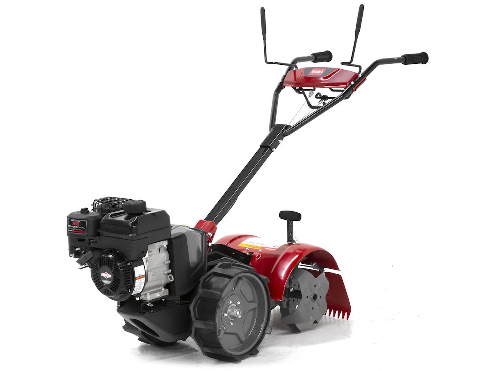 The Toro® Dual Direction Rear Tine Tiller features a 127cc Briggs and Stratton engine that delivers optimal power to the rear-mounted tines for impressive soil turning capability without sacrificing maneuverability. Dual Direction tines allow the tiller to bust through sod in CRT mode, and polish the perfect seed bed in SRT mode. Featuring instant reverse, a simple pull of a handle allows you to back up without shifting gears. Dual control handlebars and a compact footprint make maneuvering in tight spaces a breeze and allow for one handed operation. The super-wide airless tires never go flat and provide incredible traction.